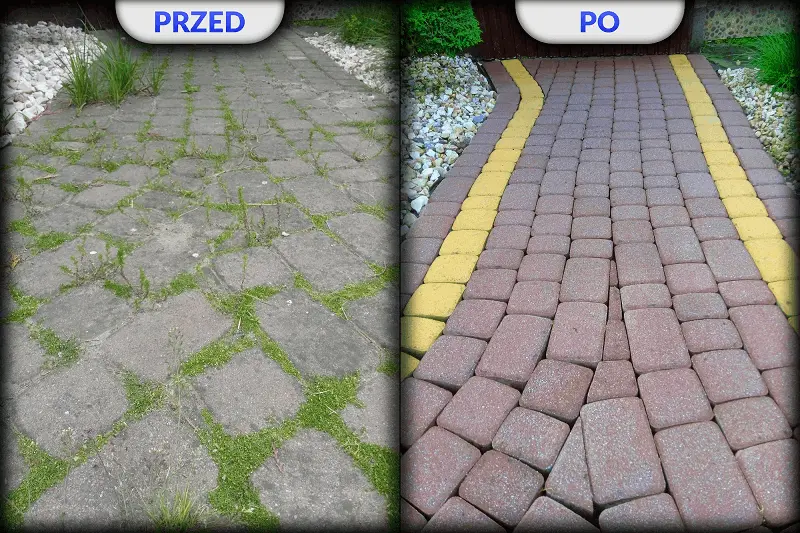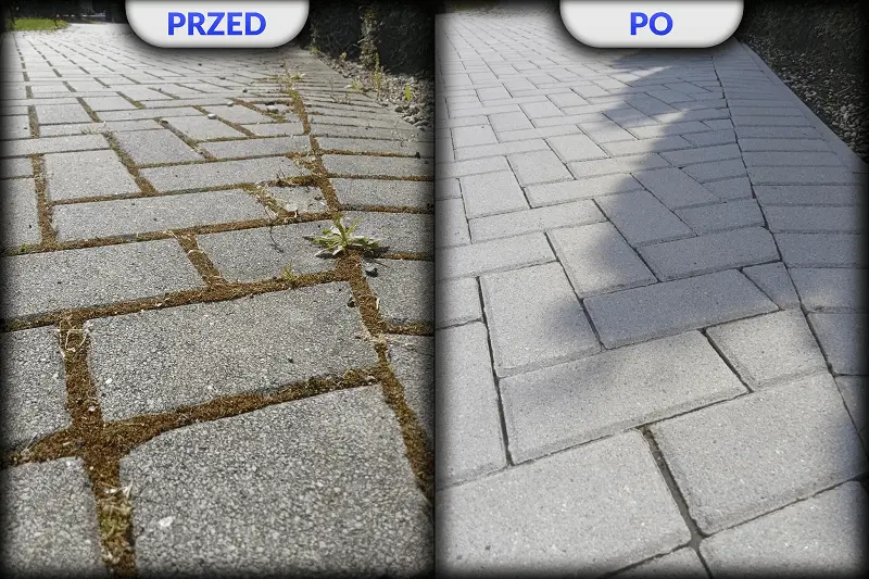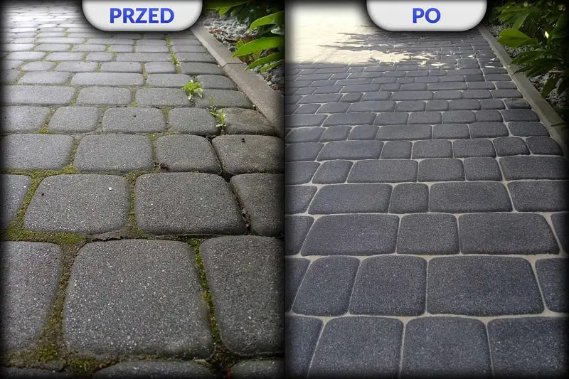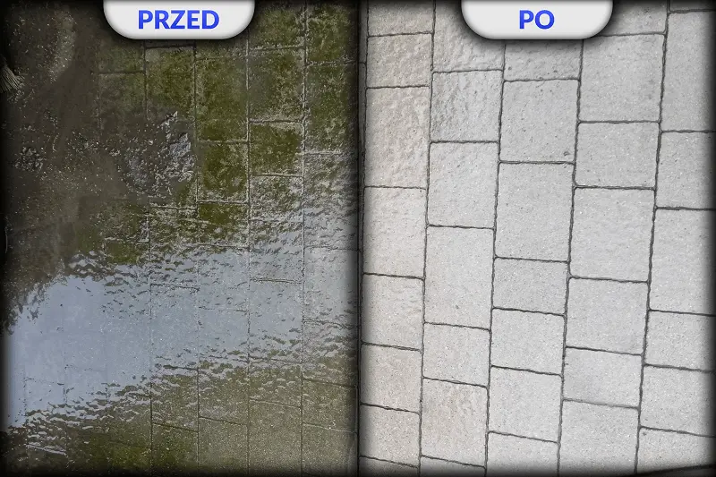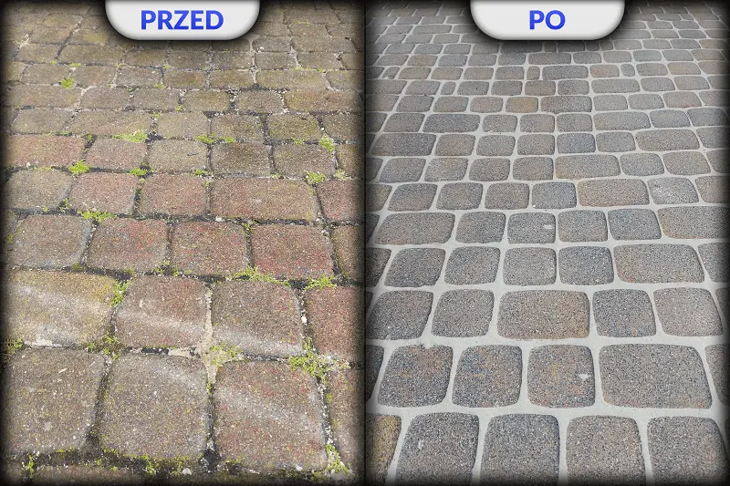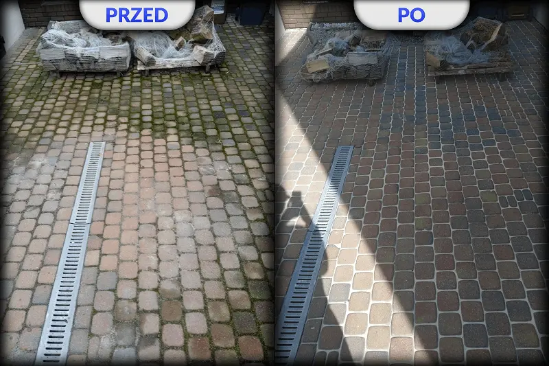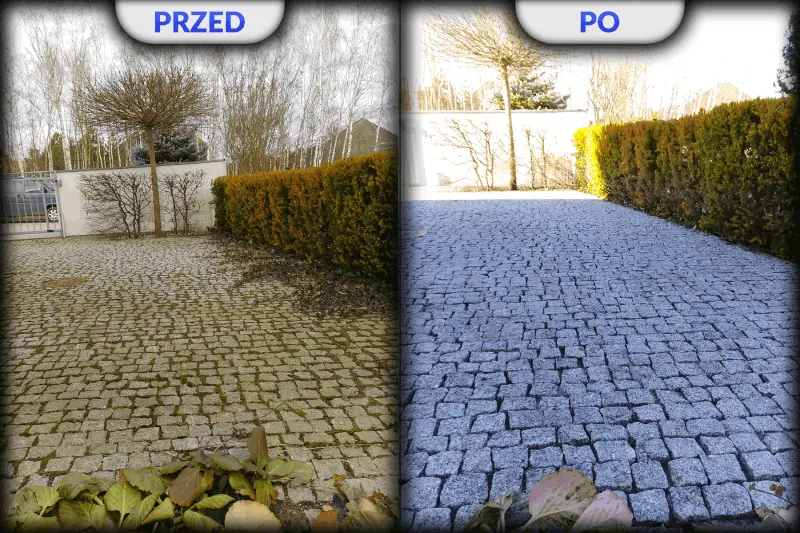 Czyścimy kostkę brukową przy użyciu technologii Mosmatic i myjki 300 bar. Usuwamy zabrudzenia, mchy i osady bez ryzyka uszkodzeń