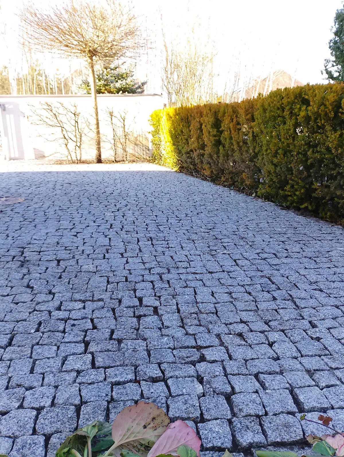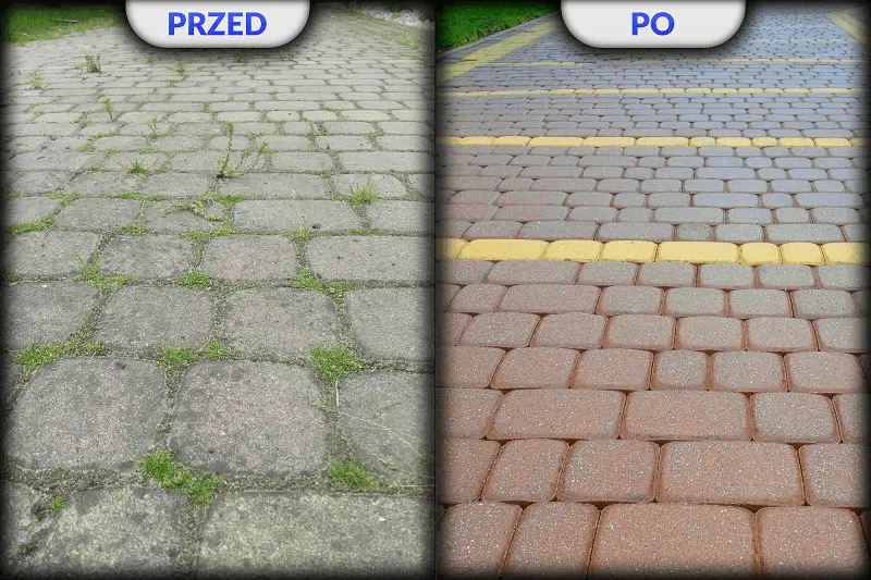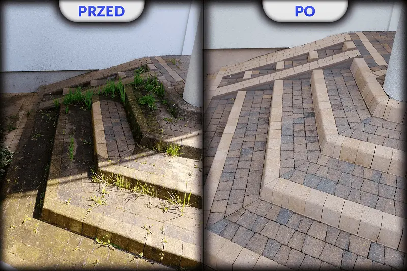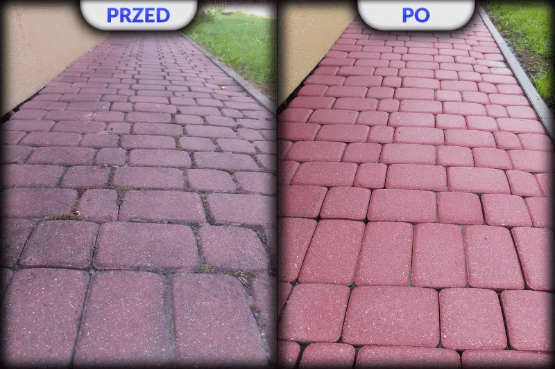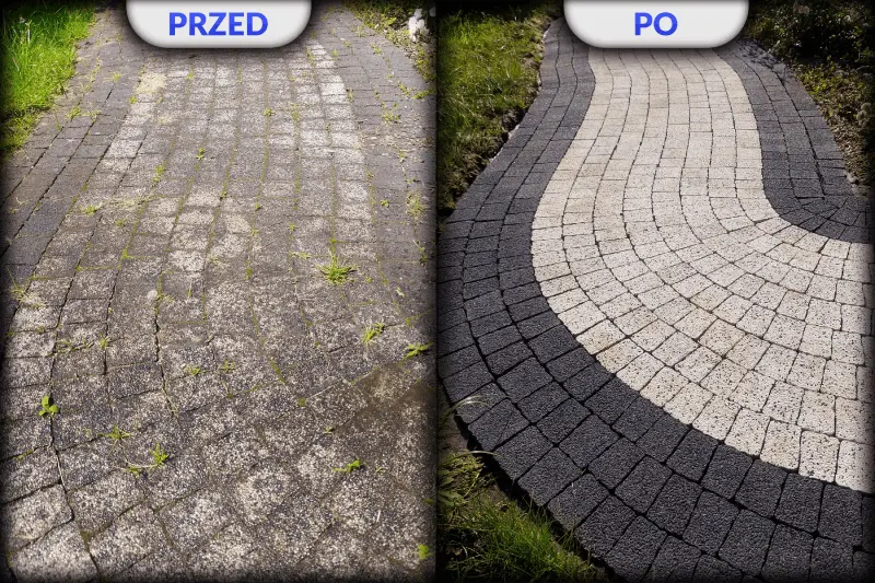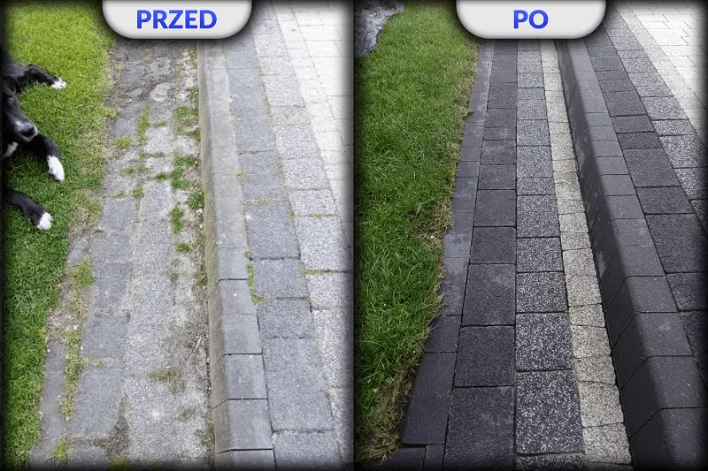 Czyścimy kostkę brukową przy użyciu technologii Mosmatic i myjki 300 bar. Usuwamy zabrudzenia, mchy i osady bez ryzyka uszkodzeń